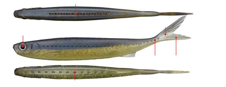 Au delà de cela, on note la forme légèrement incurvée de la queue; ce détail n'est pas un hasard: au moindre déplacement, le leurre va se mettre en mouvement.
