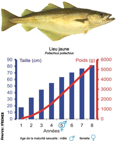 Et bien, Pollachius pollachius c'est le nom scientifique de ce poisson, fait partie de la famille des Gadidae, comme ses "cousins" cabillaud, merlan et lieu noir. On le trouve en Atlantique, Manche et Mer du Nord, du Portugal jusqu'en Norvège et à l'ouest de l'Ecosse. Les juvéniles sont très présents à la côte, alors que les poissons de plus belle taille ont tendance à rechercher davantage de profondeur; Le Lieu jaune peut être évoluer jusqu'à 150-200m de profondeur. La taille minimale de capture autorisée en France est fixée à 30cm, ce qui correspond encore à un stade biologique où les poissons n'ont pas encore atteint l'âge de se reproduire. En effet, la mâturité sexuelle est atteinte pour une taille de 30 à 40cm pour les mâles, et 40 à 50cm pour les femelles.