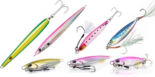 Forme des jigs: choisir une modèle allongé (slim), pour descendre vite en profondeur, et animer rapidement (par mer formée / courant); de forme standard pour une utilisation classique, ou bien "slow", c'est à dire plus large donc plus planant, pour pêcher plus lentement (mer calme). Il est donc indispensable d'avoir à bord un assortiment de jigs de différents poids, et différentes formes; la couleur peut aussi jouer, même si, souvent, le lieu réagit bien aux couleurs rouge, rose et orange;