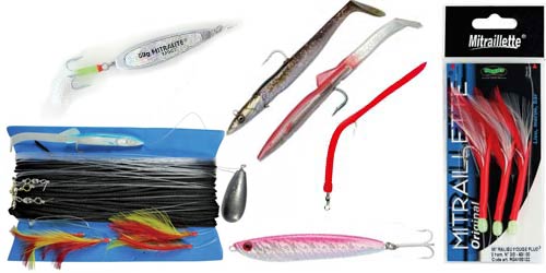 les leurres souples de forme allongées , qui sont particulièrement efficaces; il faut savoir que le lançon est une proie qui intéresse beaucoup le lieu; De plus, un leurre allongé va mieux tenir le courant, ce qui peut être un atout dans certaine situations de pêche; dans cette catégorie, on trouve notamment les Crazy Sand Eel (pour les pêches dynamiques), Black Eel (pour les pêches lentes), le Madeel 140 / 190 , le Fire Eel Delalande, le Blue Equille Flashmer
