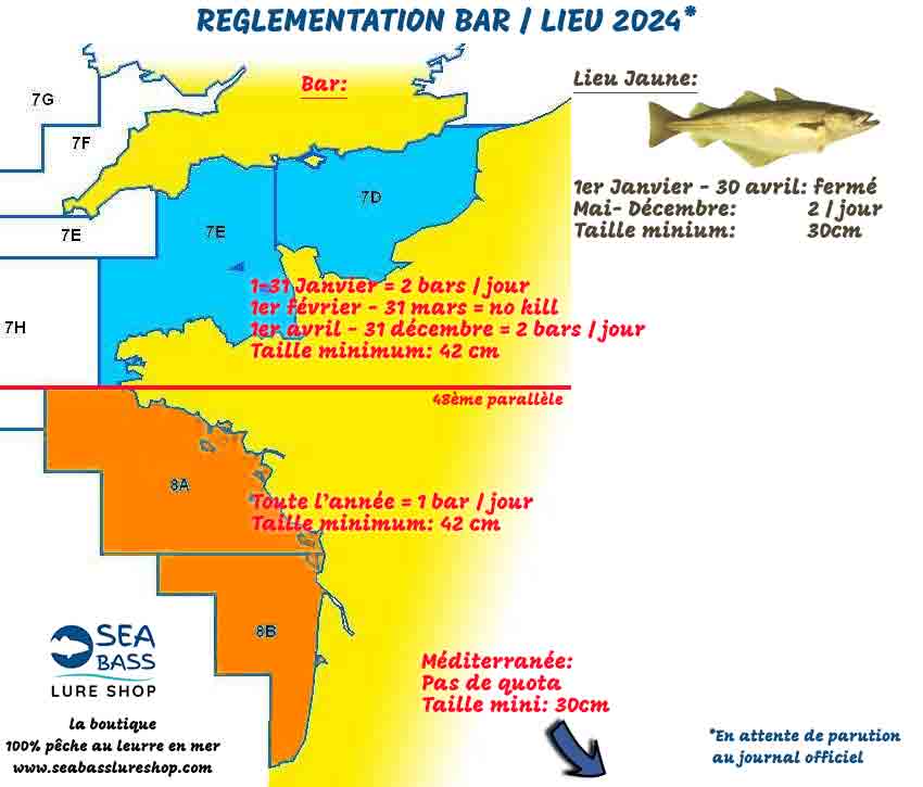 Les négociations au sein de l' Union Européenne ont permis d'aboutir à un accord, concernant la gestion des pêches en 2024, pour la pêche professionnelle et aussi pour celle de loisirs. Du changement était attendu, et concerne en particulier la zone sud (sud du 48ème parallèle), avec un quota fixé à présent à 1 bar par pêcheur et par jour. Le lieu jaune est aussi davantage règlementé, avec une fermeture totale pour la pêche de loisir de janvier à avril, puis la pêche sera autorisée avec un quota de 2 lieus jaunes par pêcheur et par jour.
